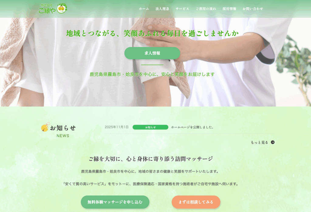 訪問マッサージを通して「人と人とのご縁を大切にしたい」という想いを持たれる「ご縁や」様のホームページ制作を担当しました。 やさしさと清潔感を表現するため、グリーン系を基調とした配色と丸みを帯びた柔らか…